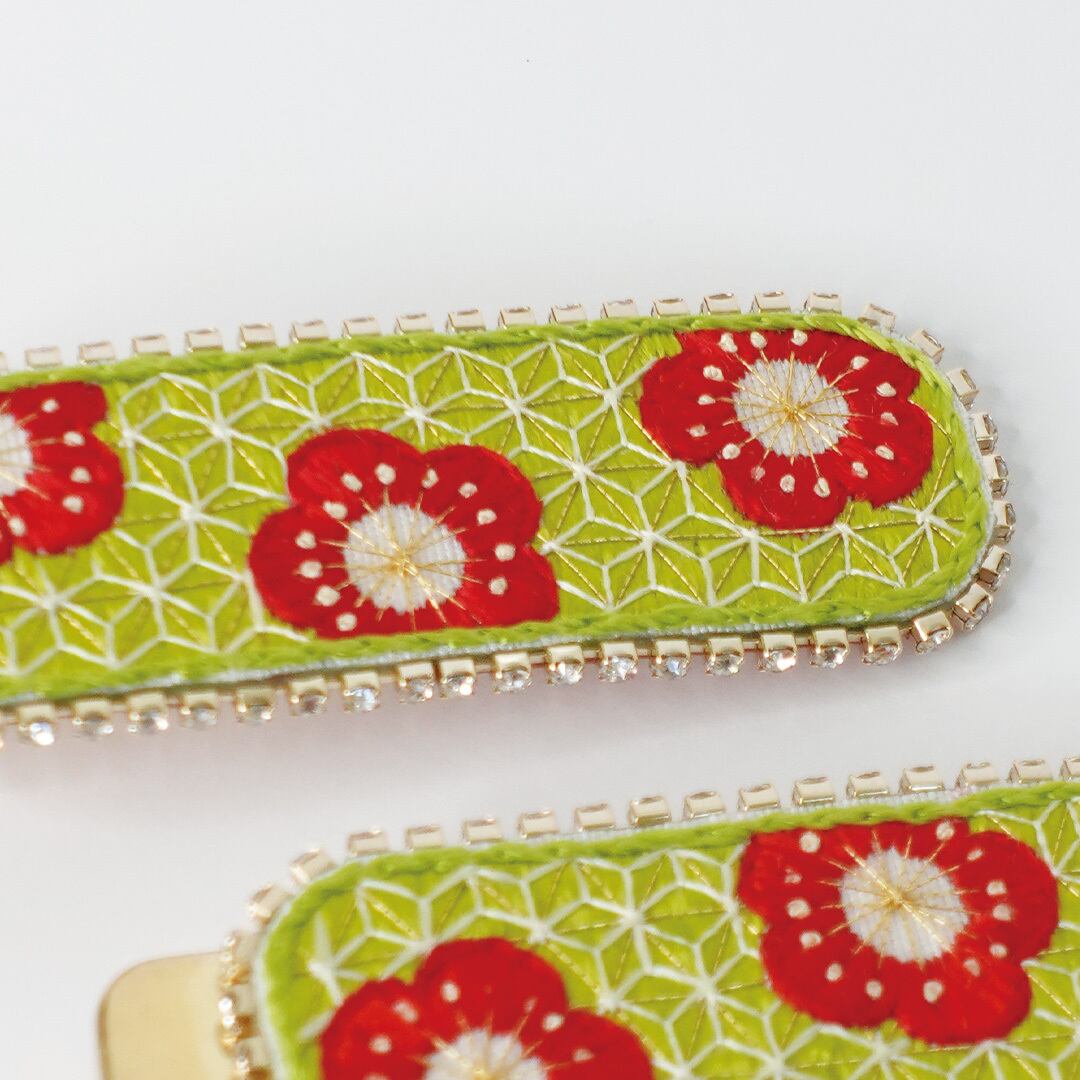This product is a hair accessory featuring the motif of plum blossoms, adorned with the traditional Japanese embroidery technique known as 'kasane-nui' (hemp leaf pattern).