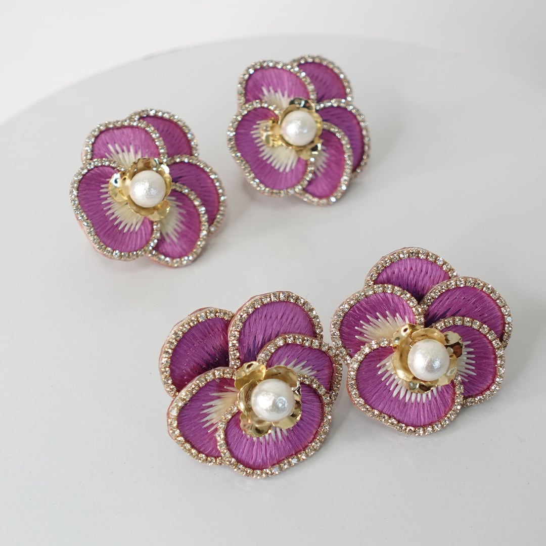 These earrings feature a pansy flower motif and are delicately embroidered using the traditional Japanese craft of Nihon Shishu (Japanese embroidery).